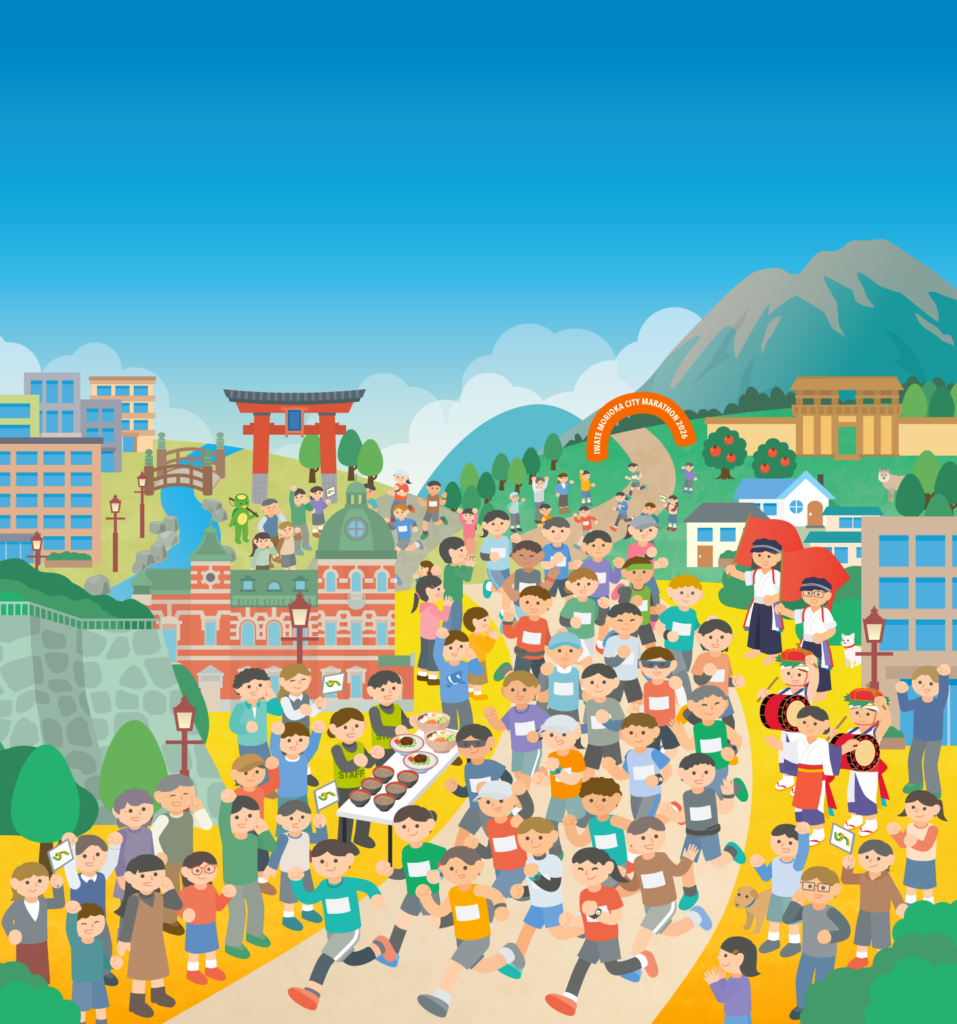 大会テーマどおり、いわて盛岡にたくさんの人が集い、走る人、応援する人、大会スタッフ・ボランティアなどみんなで大会が彩られている様子が表現されています。