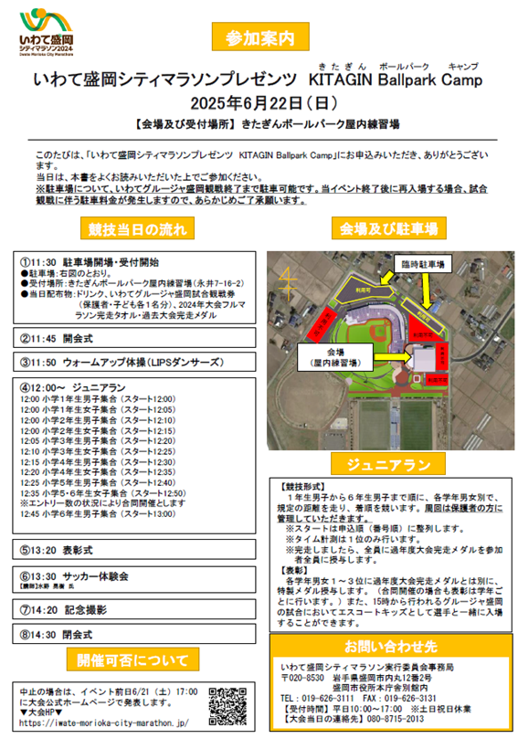 明日、予定通りいわて盛岡シティマラソンプレゼンツ KITAGIN Ballpark Campを開催します! 飛び入り参加もOKです!皆様のお越しをお待ちしております!!
