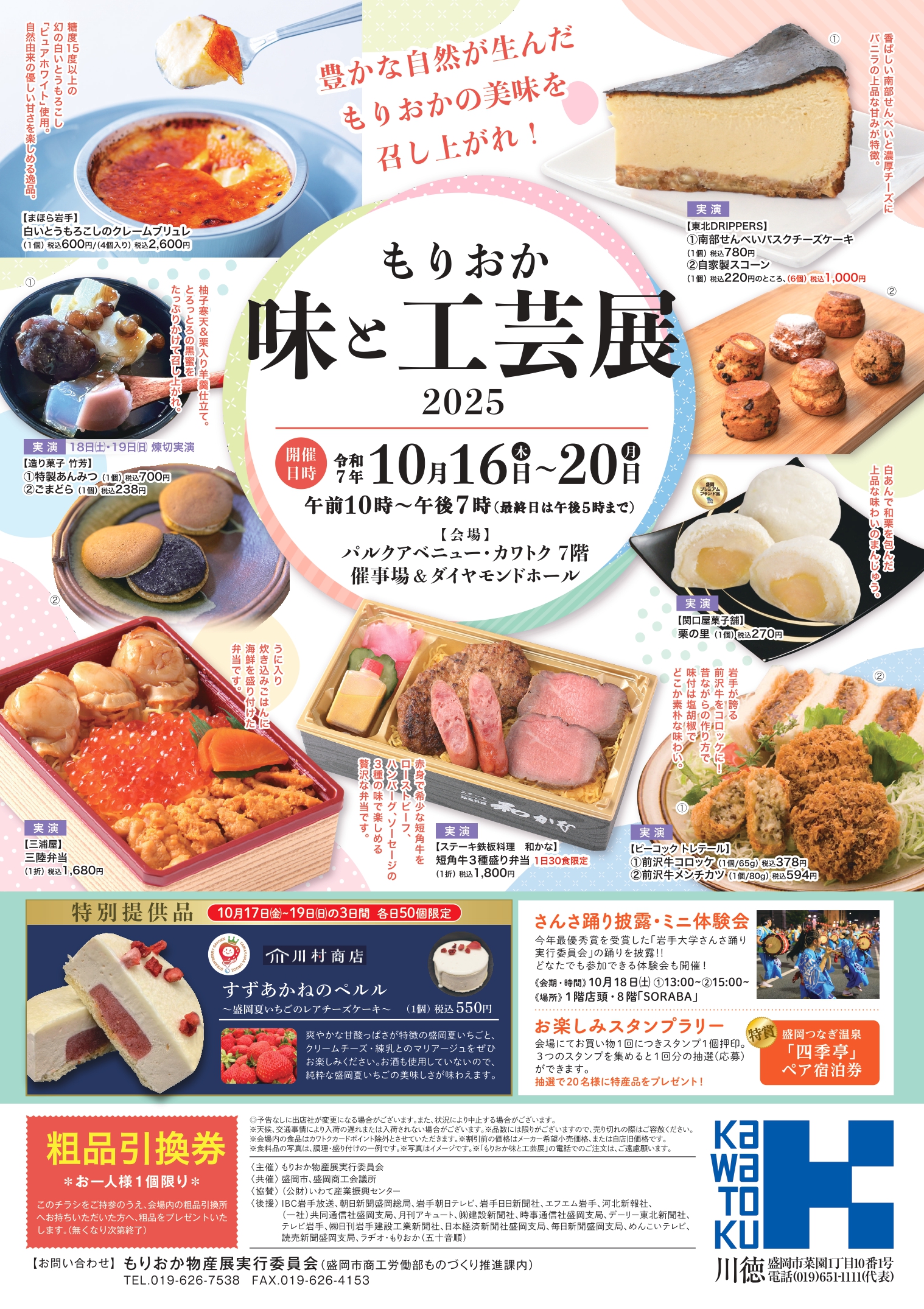 10月16日(木)~20日(月)の4日間、盛岡の食と工芸が集結する「もりおか味と工芸展2025」が、パルクアベニュー・カワトク7F(盛岡市菜園1丁目10-1)で開催されます。